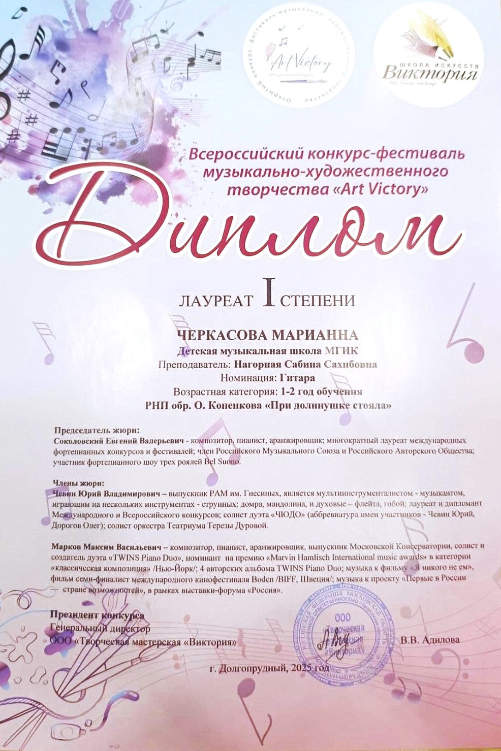 Лауреат I степени - Черкасова Марианна (Возрастная категория 1-2 год обучения в номинации Гитара)