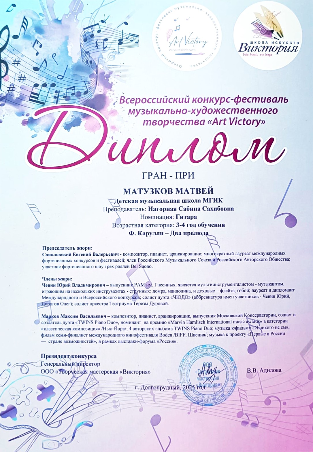 Гран-при - Матузков Матвей (Возрастная категория 3-4 год обучения в номинации Гитара)