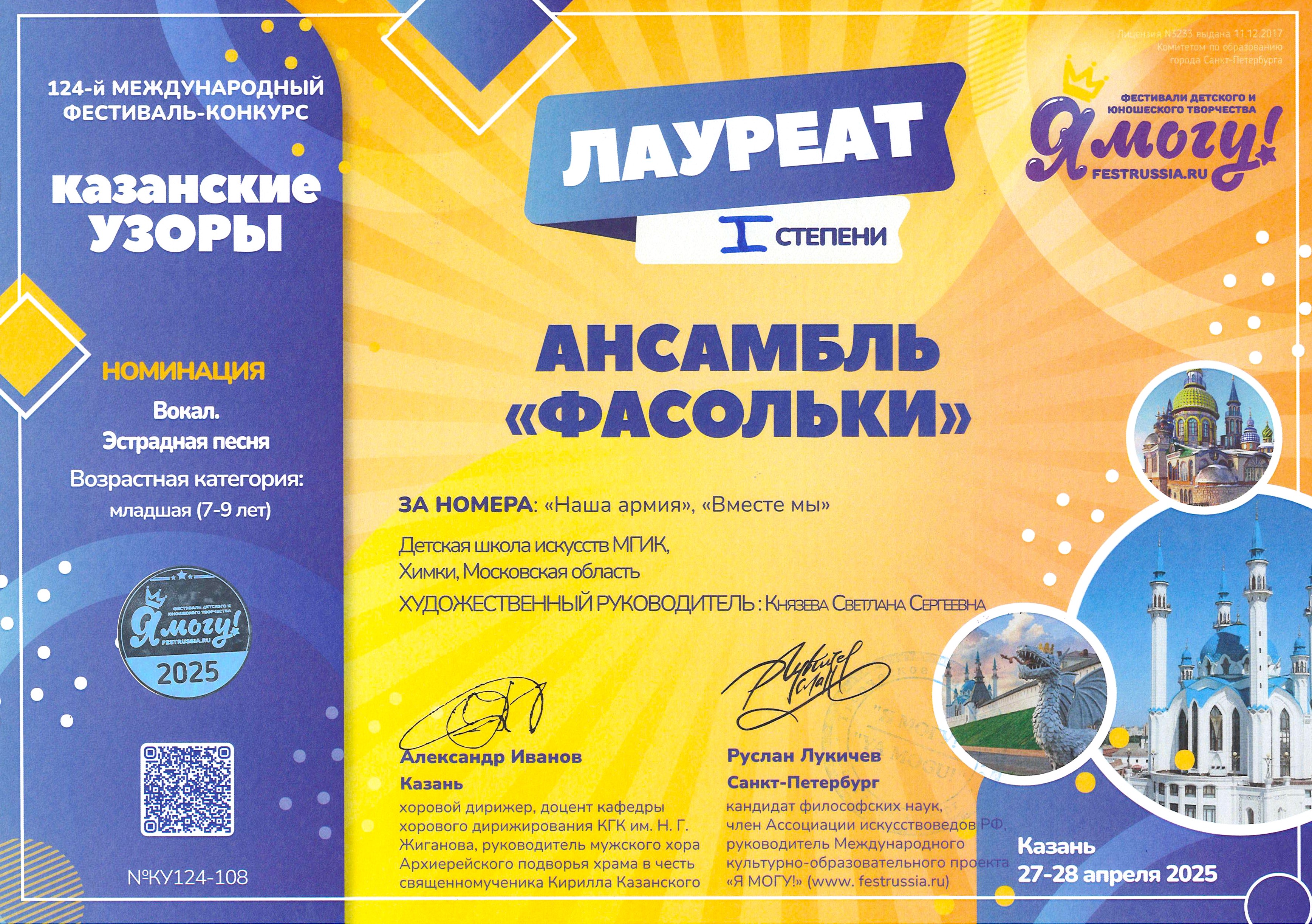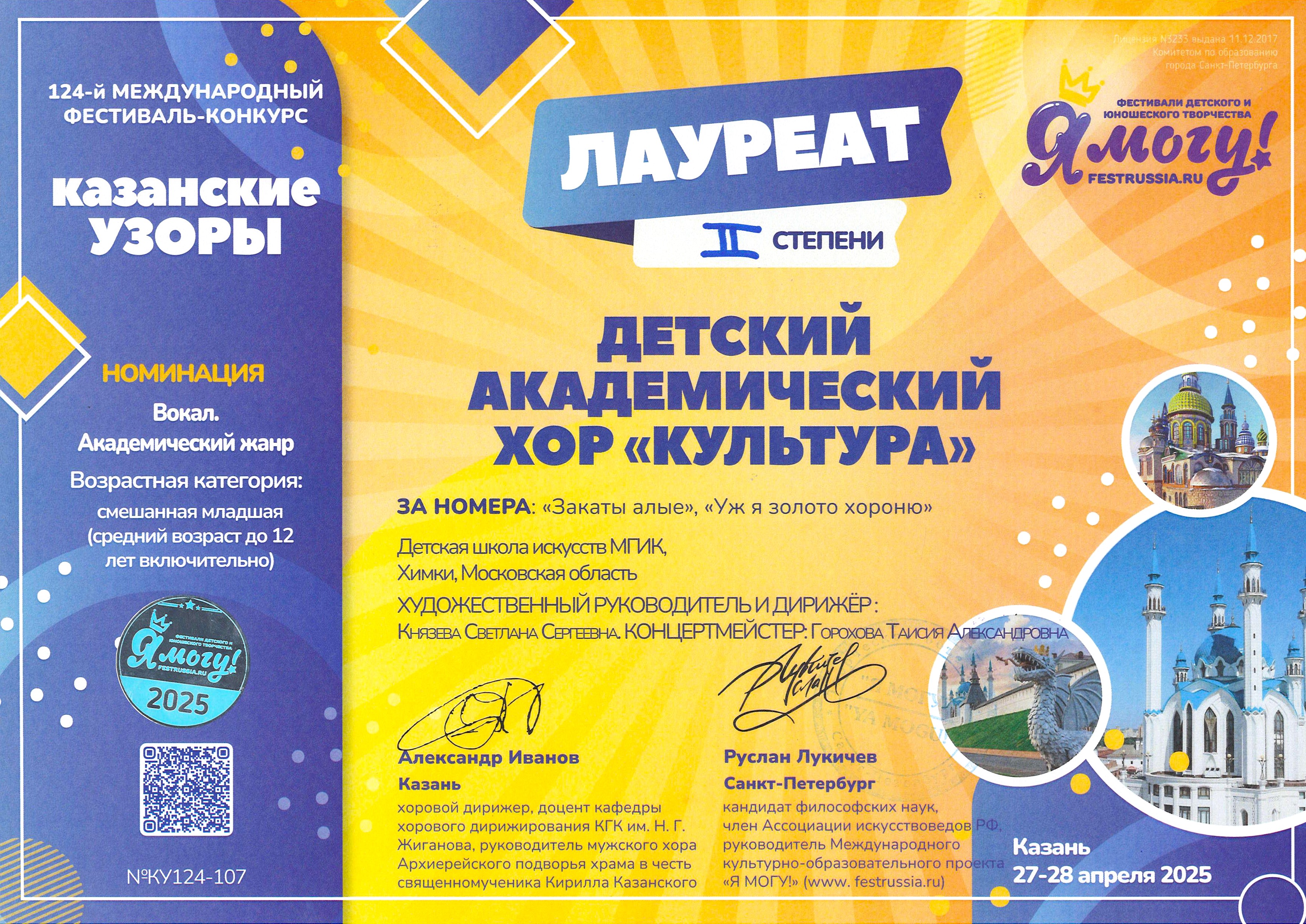 Спешим поделиться замечательными результатами обучающихся по ДПП "Хоровое пение" Детской школы искусств МГИК со 124-го Международного фестиваля-конкурса детского и юношеского творчества "Казанские узоры", который прошёл с 27 по 28 апреля в г. Казань!