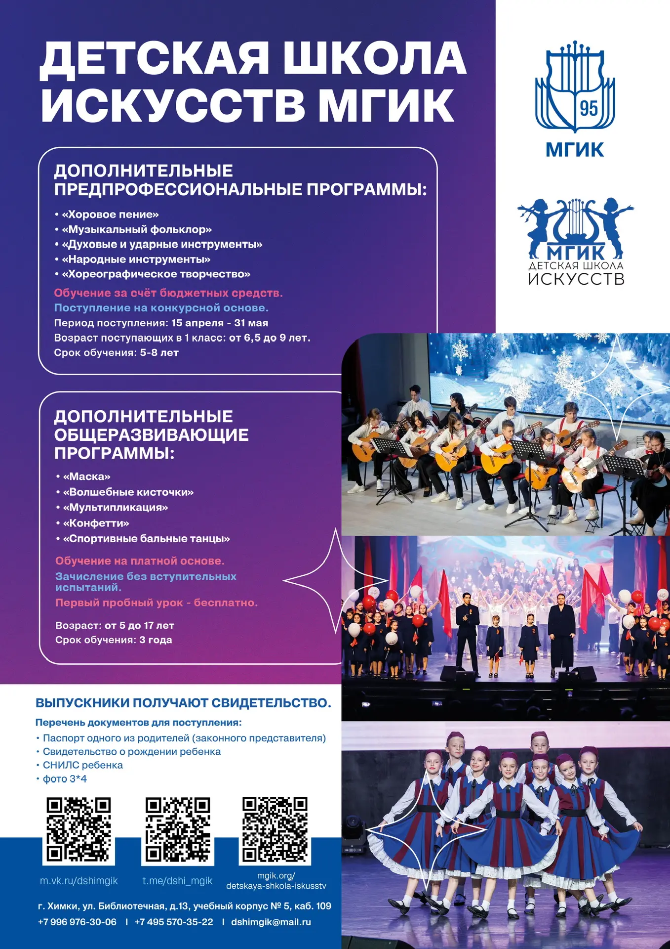 Детская школа искусств МГИК (ДШИ МГИК) объявляет набор учащихся на 2026–2027 учебный год. Приём документов продлится с 15 апреля по 31 мая. Обучение ведётся за счёт бюджетных средств.